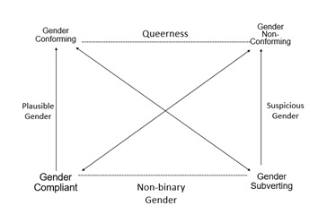 Contrariety to Gender conforming, Gender non-conforming is best described as an understanding and a disregard for ‘normative’ relations between gender identity and gender expression. We understand that masculinity is not exclusively owned by men and women do not own femininity, and even in normative gender identities we can see these mixes of expressive traits, showing gender as discursive and cultural construct. ‘Incorrect’ correlation will result in the questioning of sexuality, and assumptions that the individual is homosexual will be produced via the heterosexual matrix trying to produce conformity